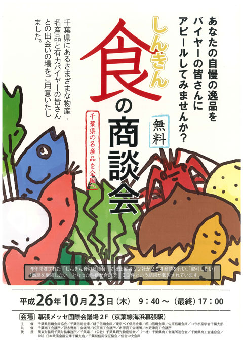 佐原信用金庫さんのご紹介で、平成26年10月23日(木)に千葉市幕張メッセで開催される「平成26年しんきん食の商談会」に出展者として参加させていただくこととなりました。